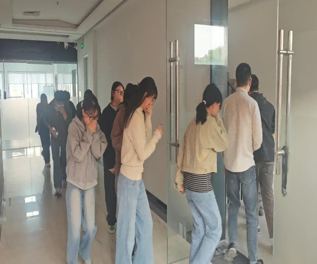 • Guided by team leaders, employees evacuated along fire escape routes (bending down, covering mouths and noses) to the assembly point.